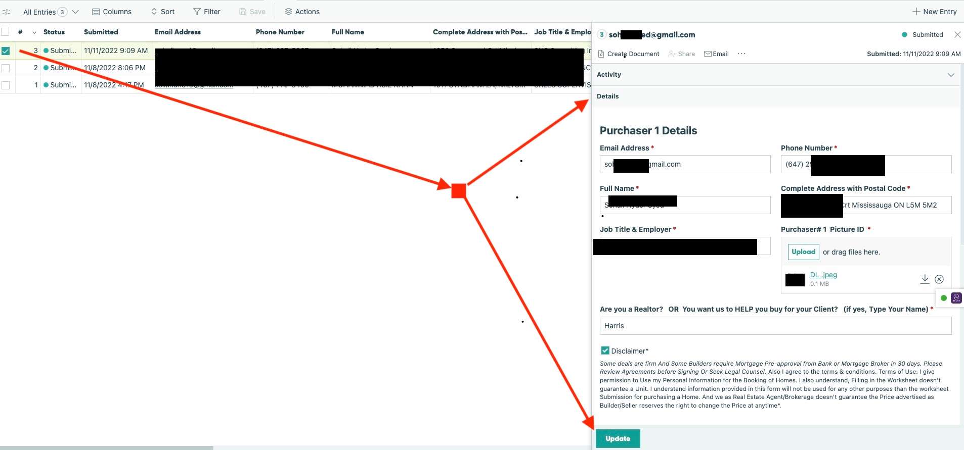 Form Submissions Open as popup to be updated and Viewed with one click